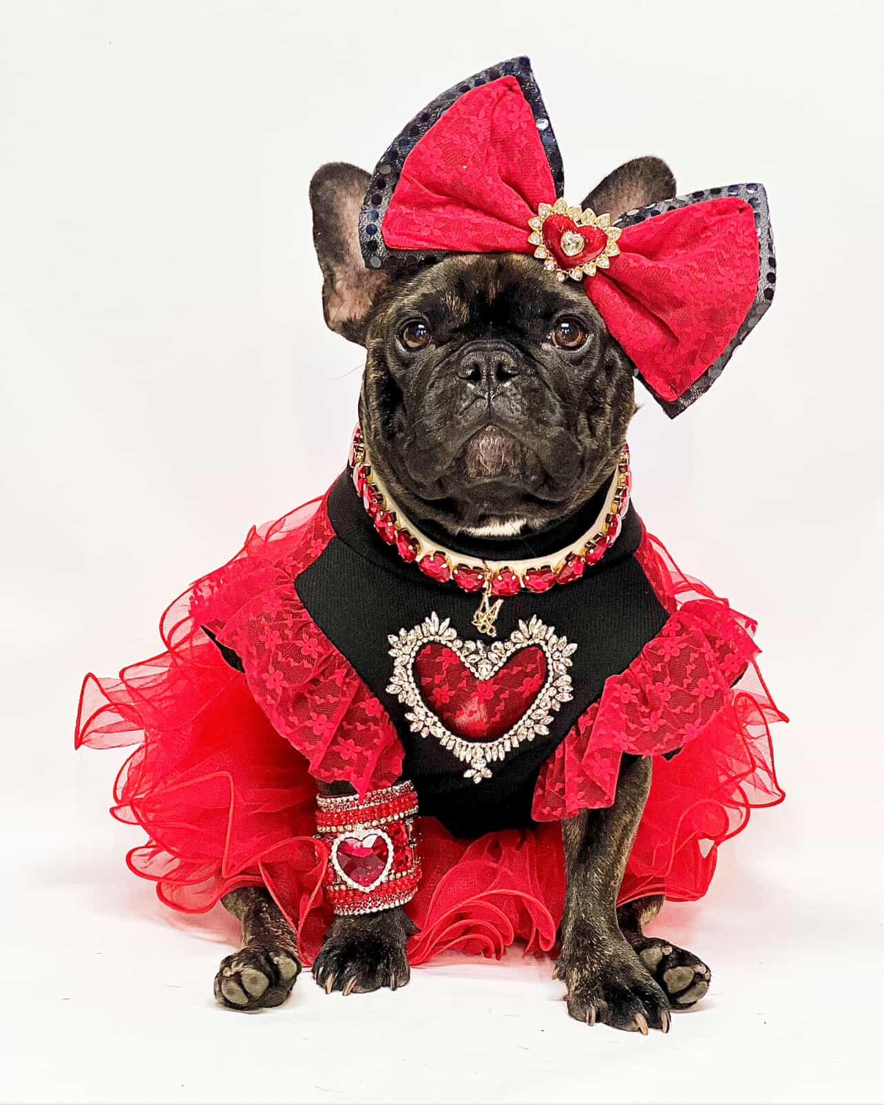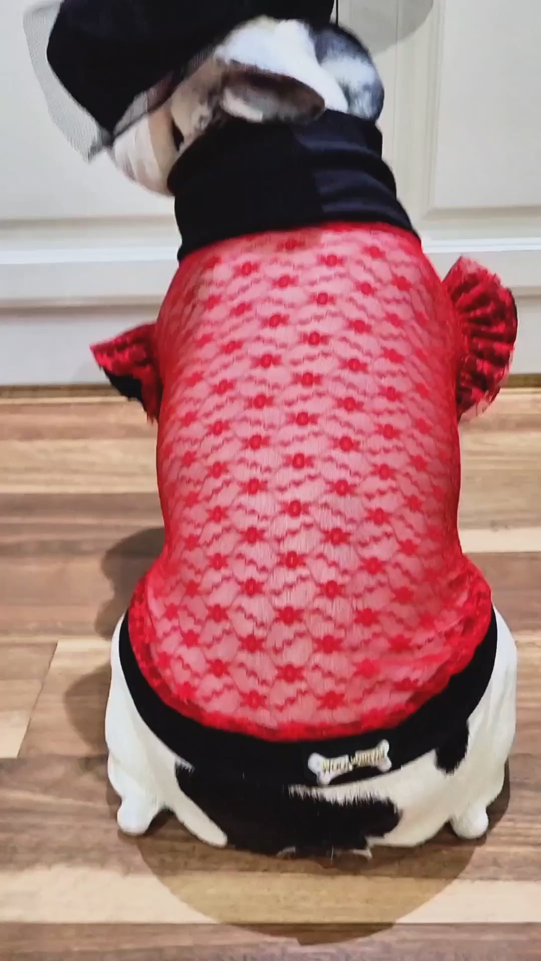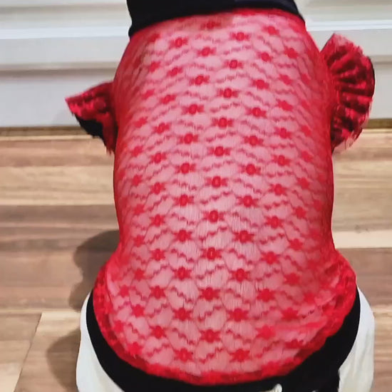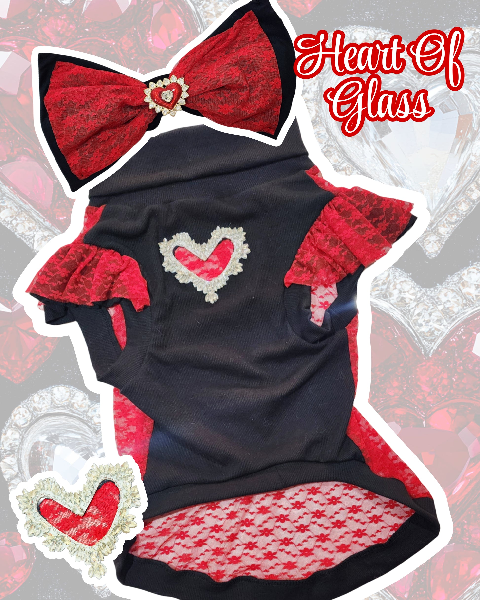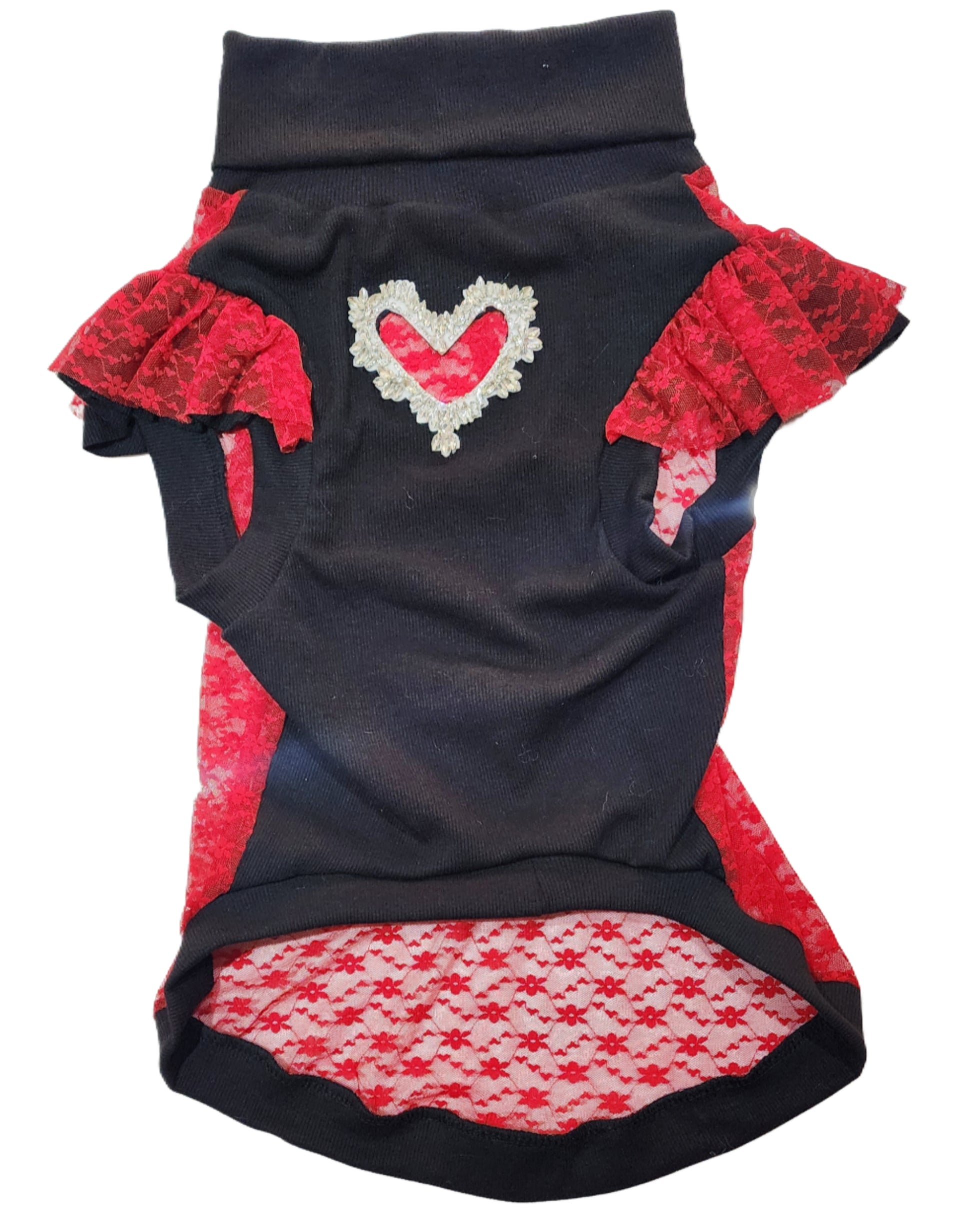 The Heart of Glass pet shirt is the perfect accessory for Valentine's Day. Featuring a stunning rhinestone hollow cut out Heart on the chest, paired with red lace and black lycra, this shirt will make your furry friend stand out. Don't miss the chance to show off your love in style.